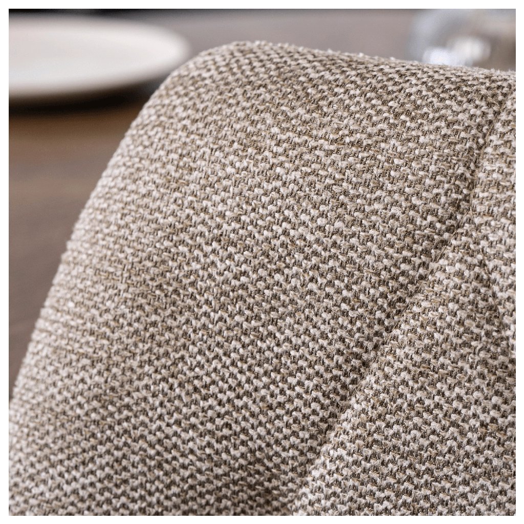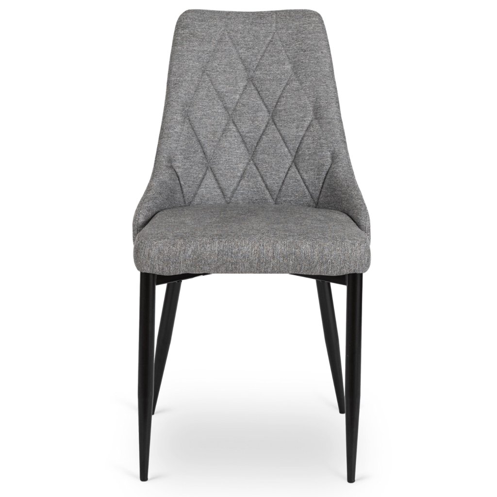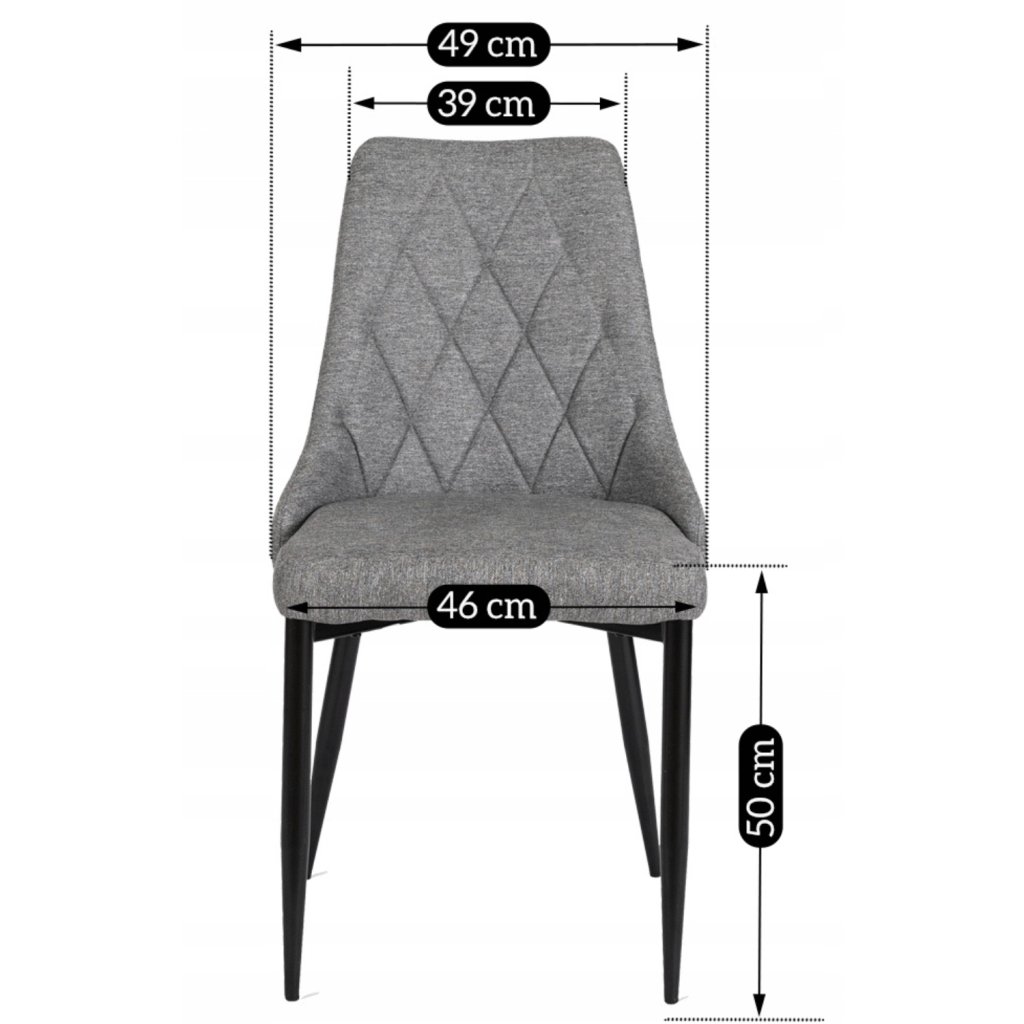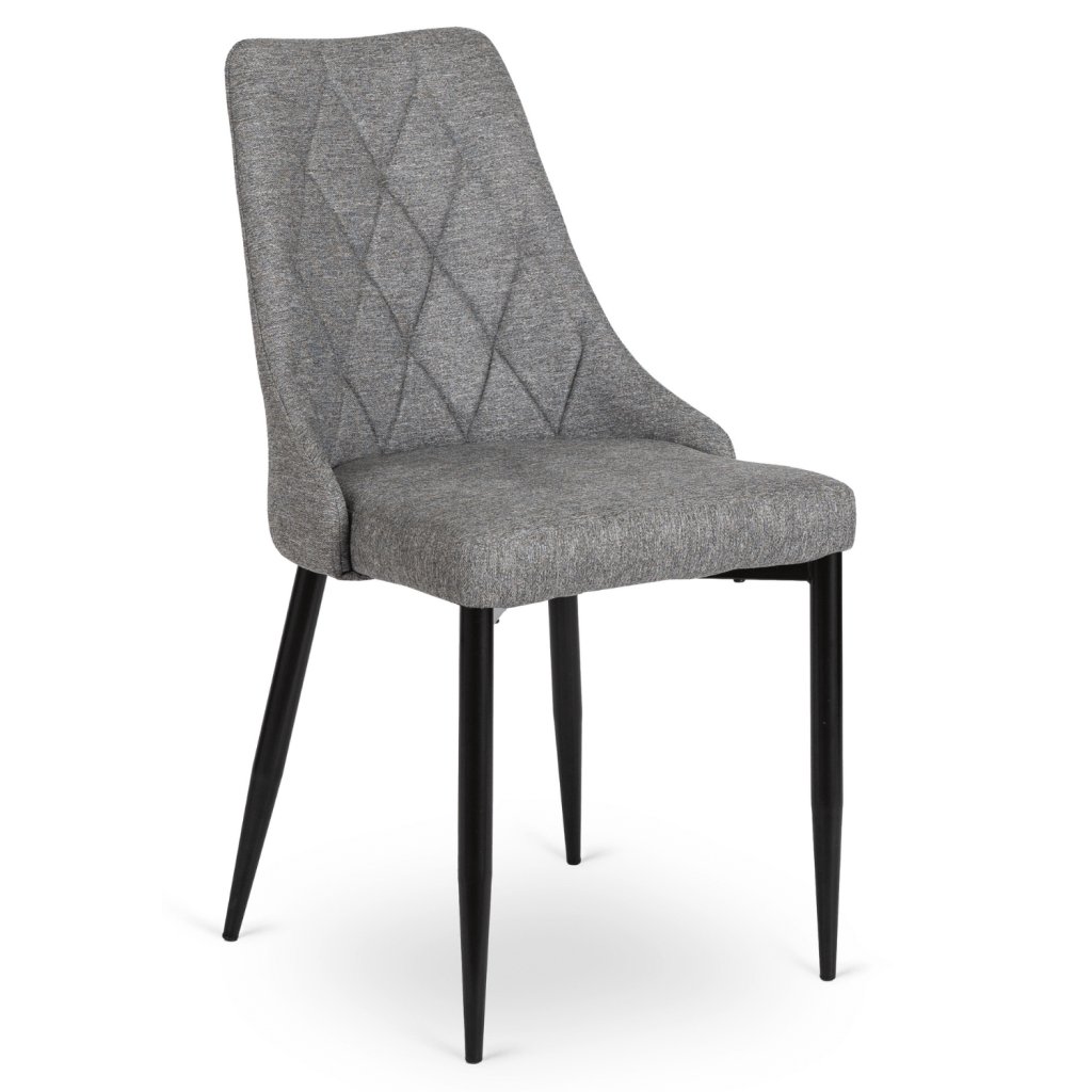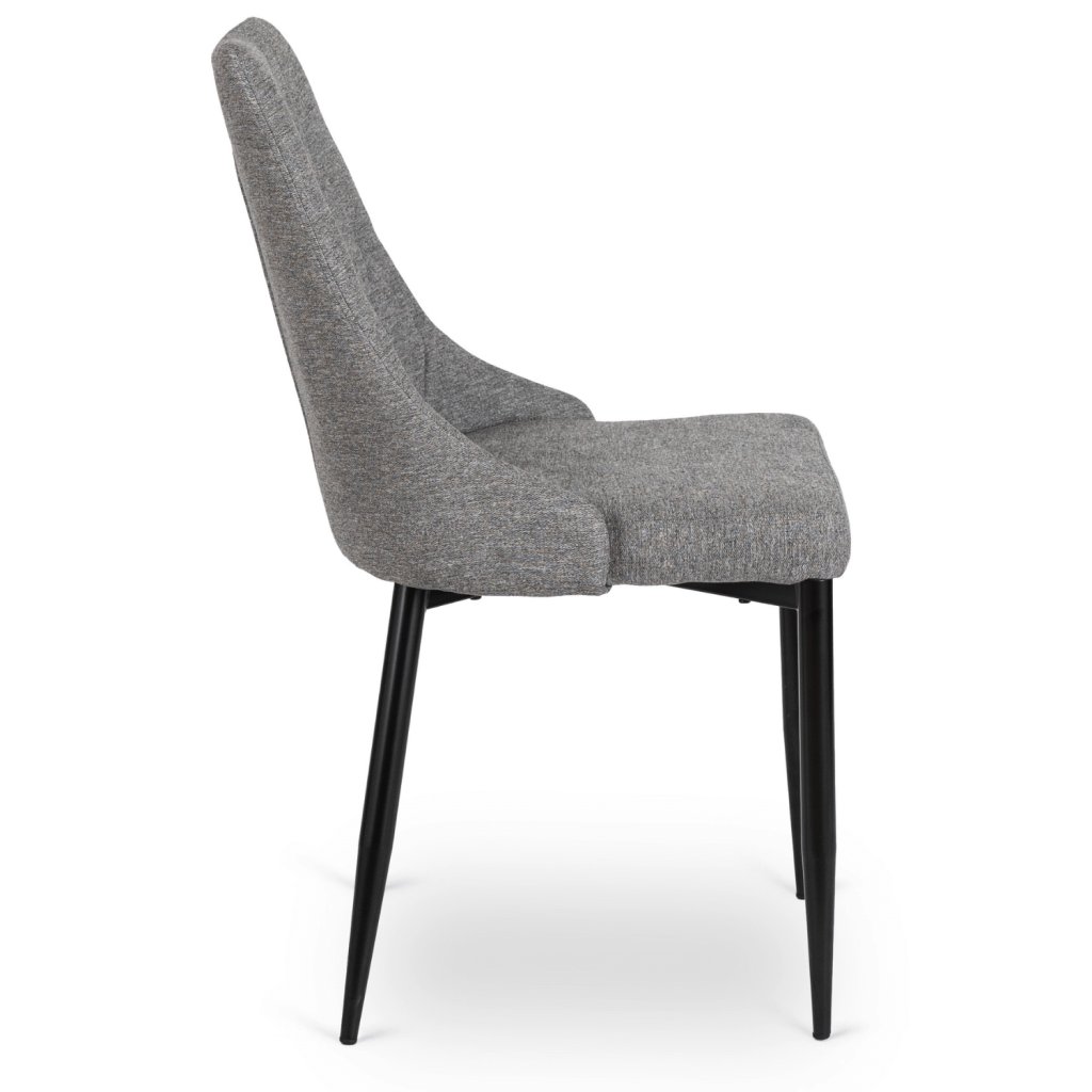 Stolička má konštrukciu z kovu s čiernou práškovou povrchovou úpravou, čo zaručuje stabilitu a dlhú životnosť. Sedadlo a operadlo sú čalúnené tkanou látkou, vnútri vyplnené hustou penou, čím je zaistené pohodlie a odolnosť proti vychádzaniu z tvaru. Tkanina je ľahká na údržbu a v prípade bežného používania ju stačí jednoducho utrieť — preto je praktická aj v domácnostiach s deťmi alebo domácimi miláčikmi.