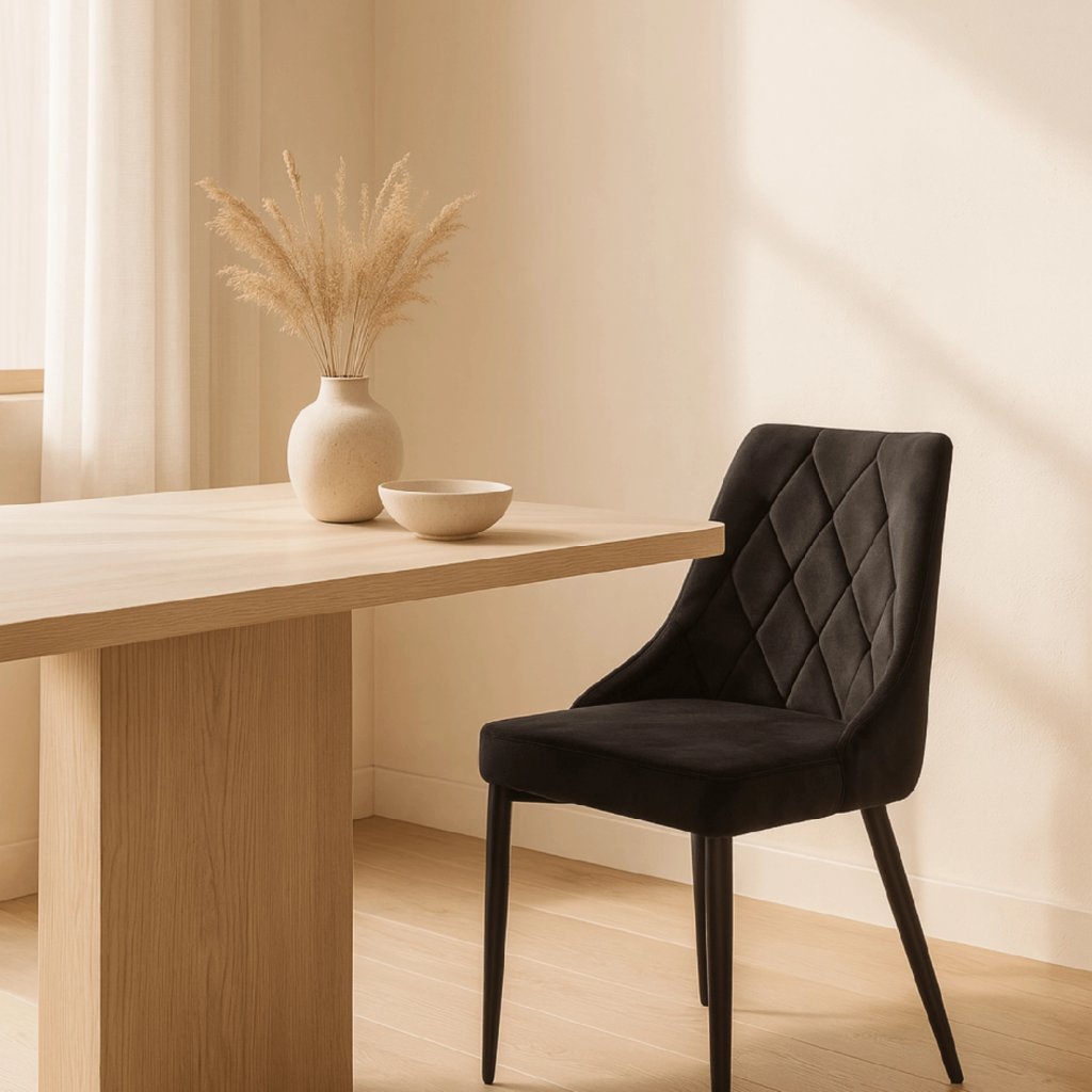 Stolička je vyrobená z najkvalitnejších materiálov. Sedák a operadlo sú potiahnuté zamatovou látkou. Stolička má pevné kovové nohy s práškovým nástrekom v čiernej farbe, ktoré dodajú jedinečný efekt v každom interiéri. Nohy majú ochranu proti poškodeniu podláh.
