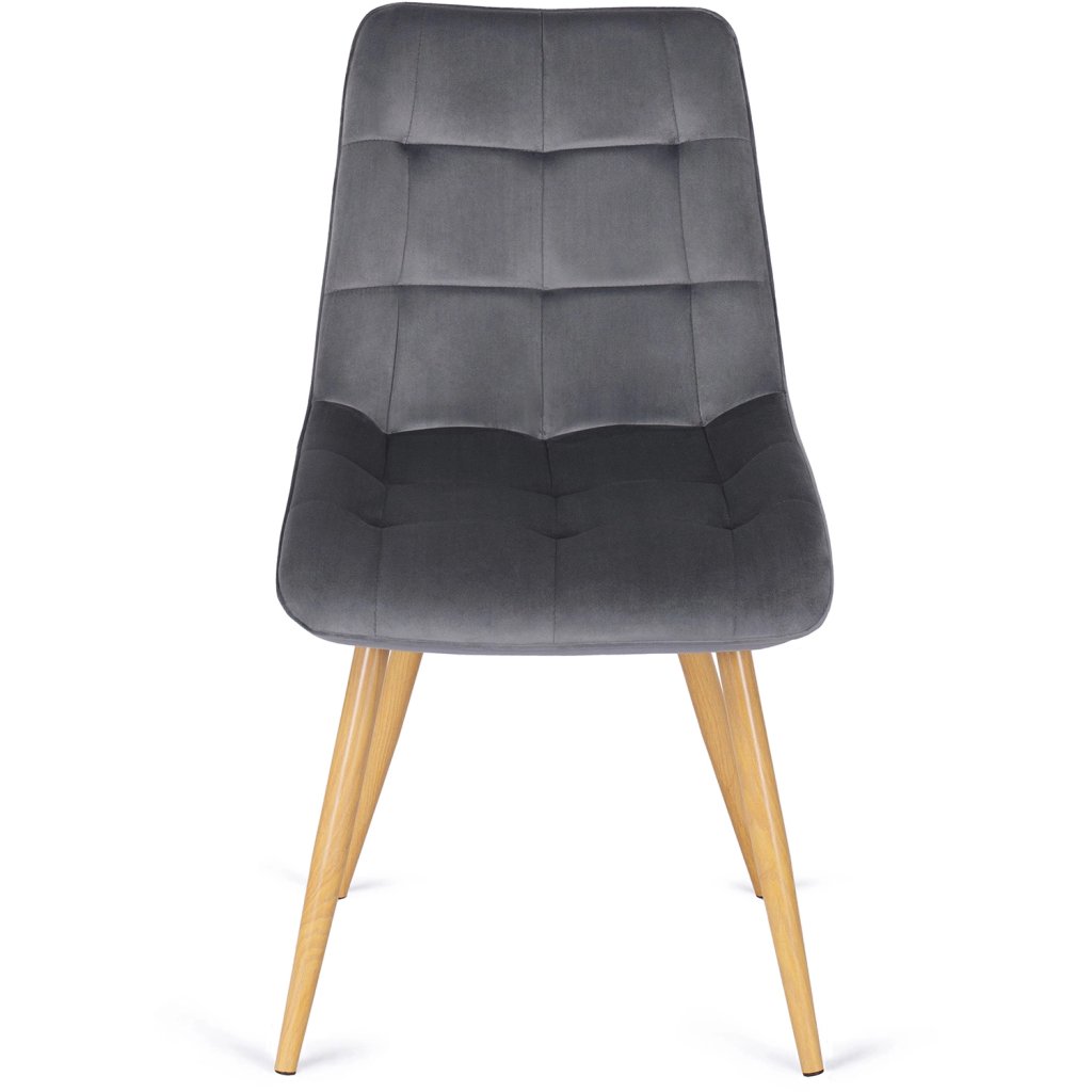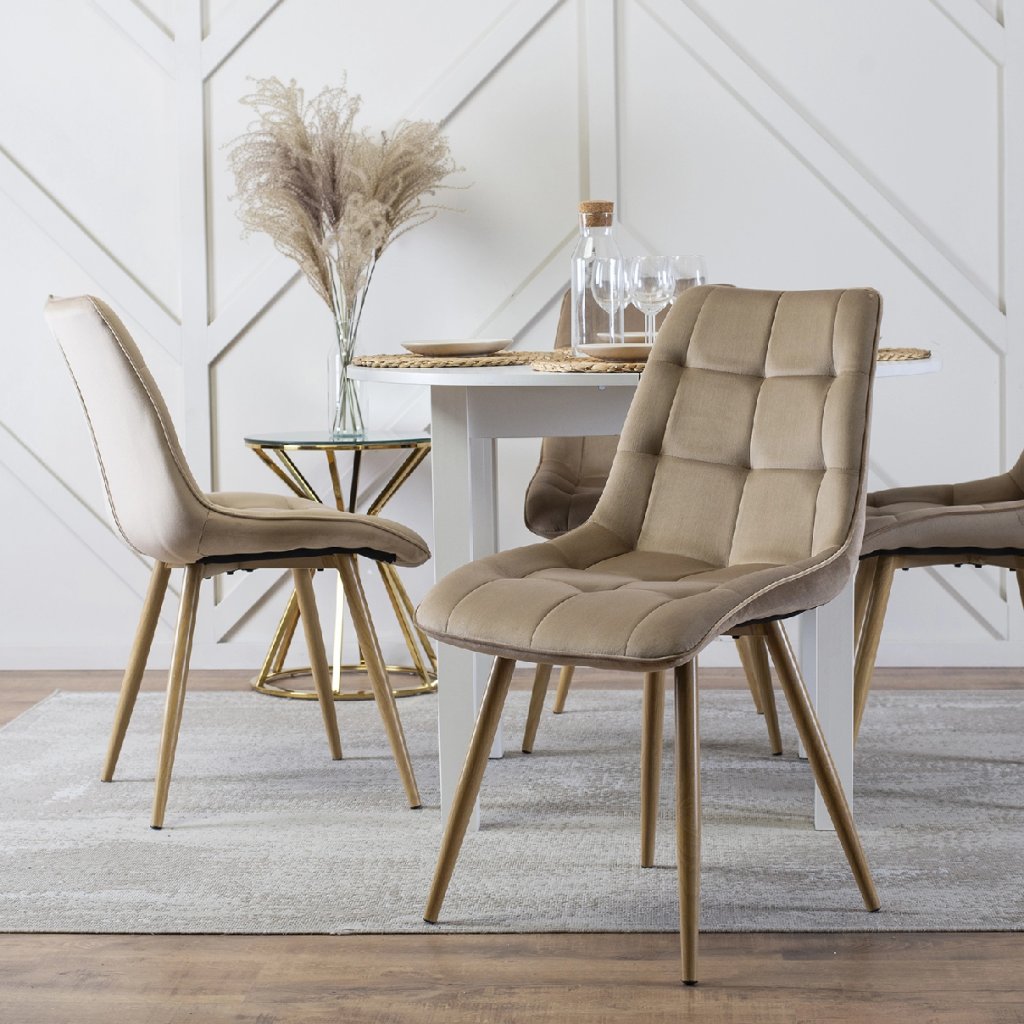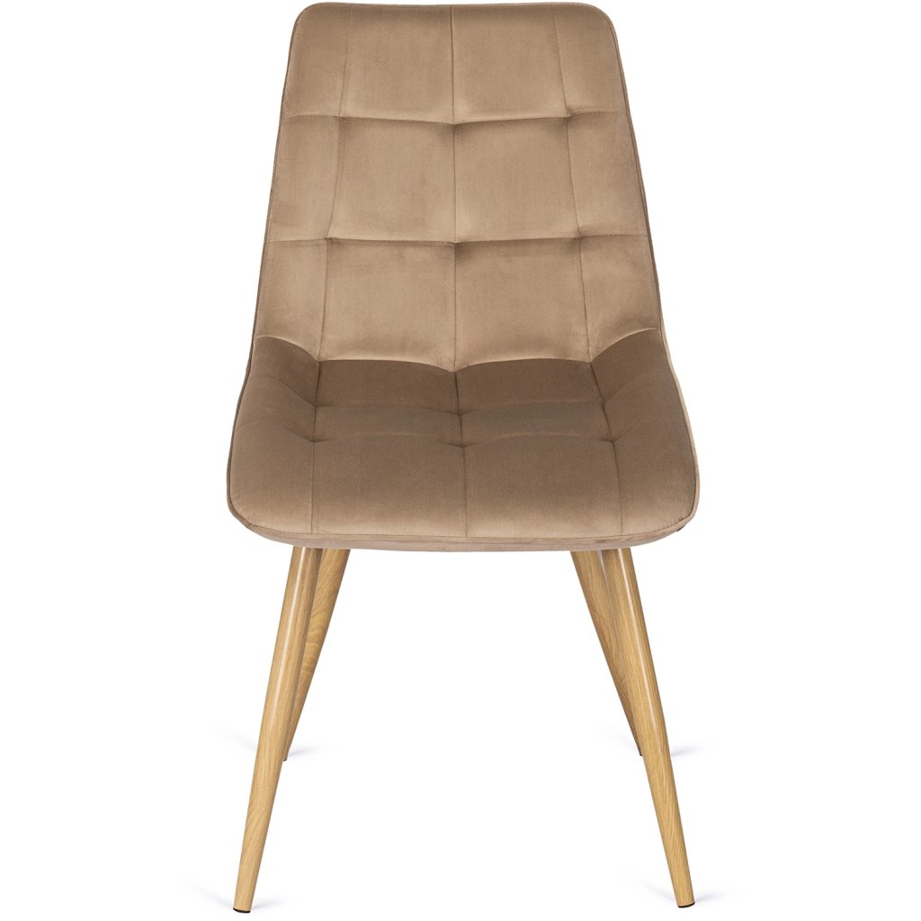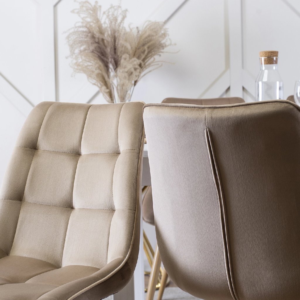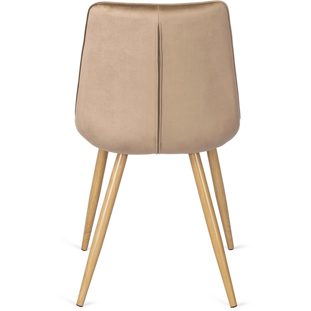 Je čalúnená jemným, príjemným na dotyk materiálom, ktorý jemne mení odtieň pri dotyku, je odolný voči mechaceniu a ľahko sa udržiava. Dekoratívne prešívanie dodáva elegantný vzhľad. Mäkké polstrovanie sedadla a operadla s vrstvou peny zaručuje pohodlné sedenie. Stabilitu poskytuje kovová konštrukcia s nohami v dekore prírodného dreva, ktoré sú pevné a odolné, pričom spodná časť nôh chráni podlahu pred poškriabaním.