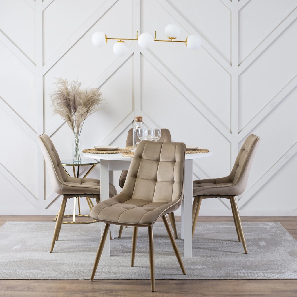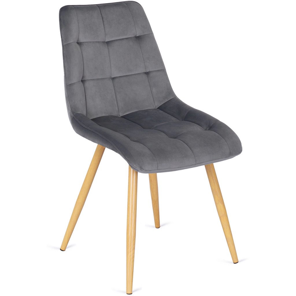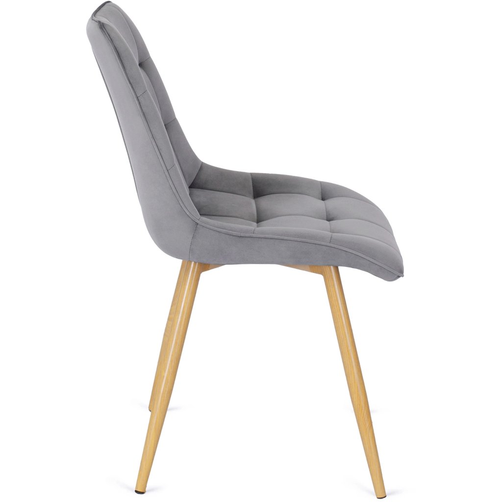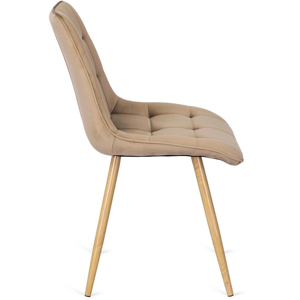 Je čalúnená jemným, príjemným na dotyk materiálom, ktorý jemne mení odtieň pri dotyku, je odolný voči mechaceniu a ľahko sa udržiava. Dekoratívne prešívanie dodáva elegantný vzhľad. Mäkké polstrovanie sedadla a operadla s vrstvou peny zaručuje pohodlné sedenie. Stabilitu poskytuje kovová konštrukcia s nohami v dekore prírodného dreva, ktoré sú pevné a odolné, pričom spodná časť nôh chráni podlahu pred poškriabaním.