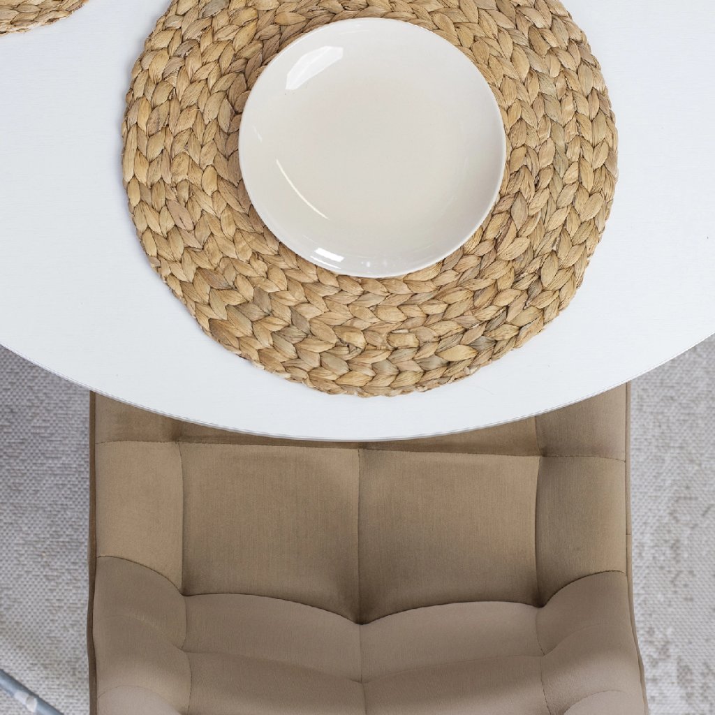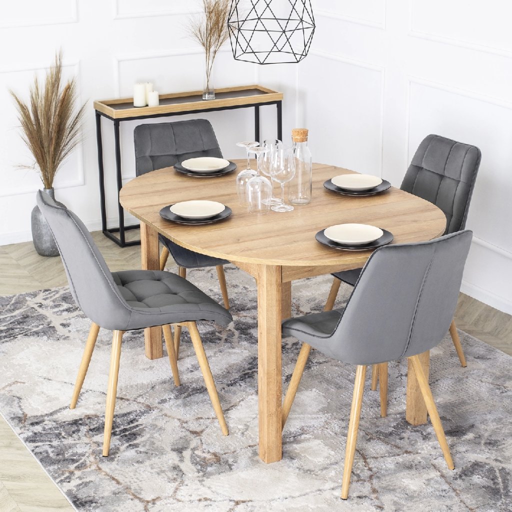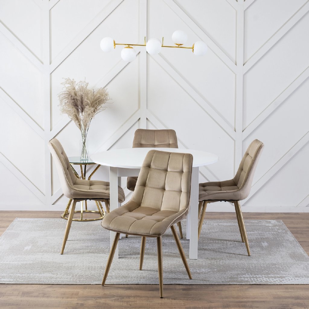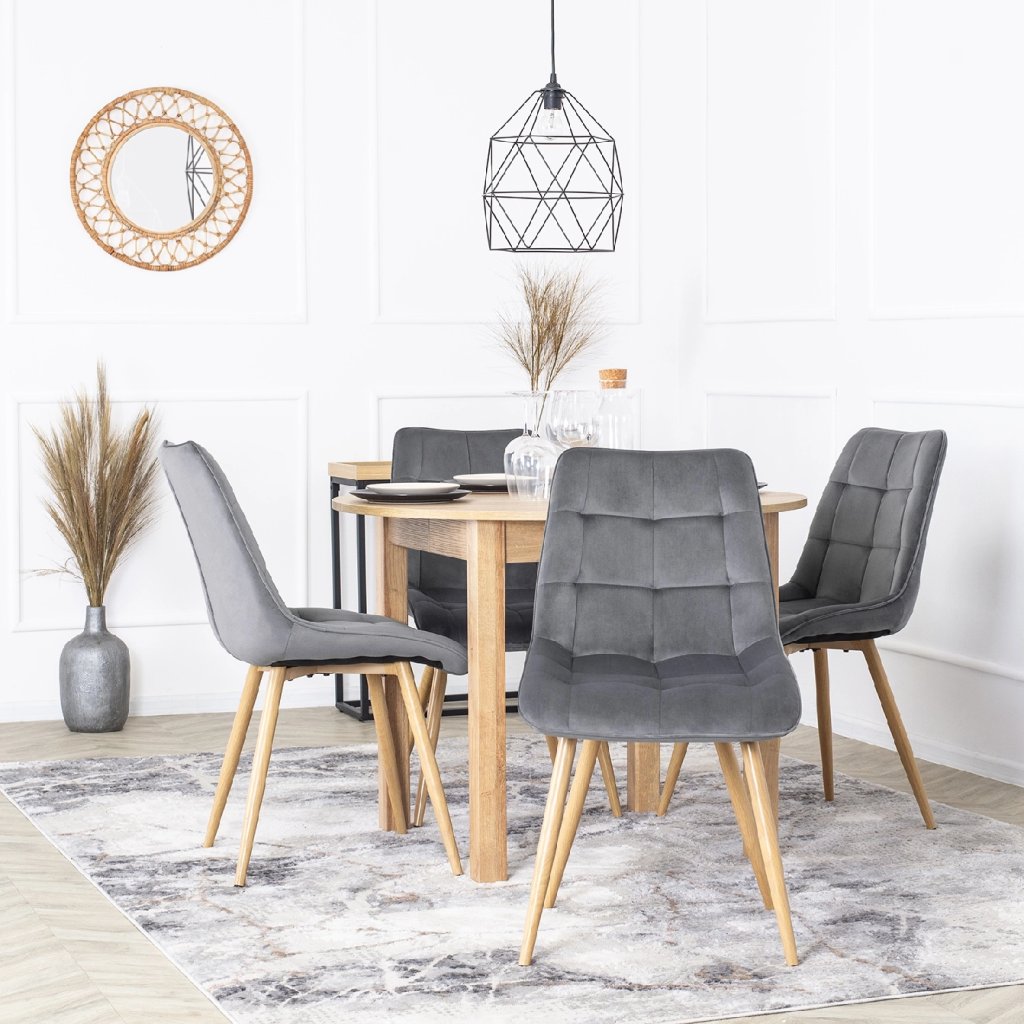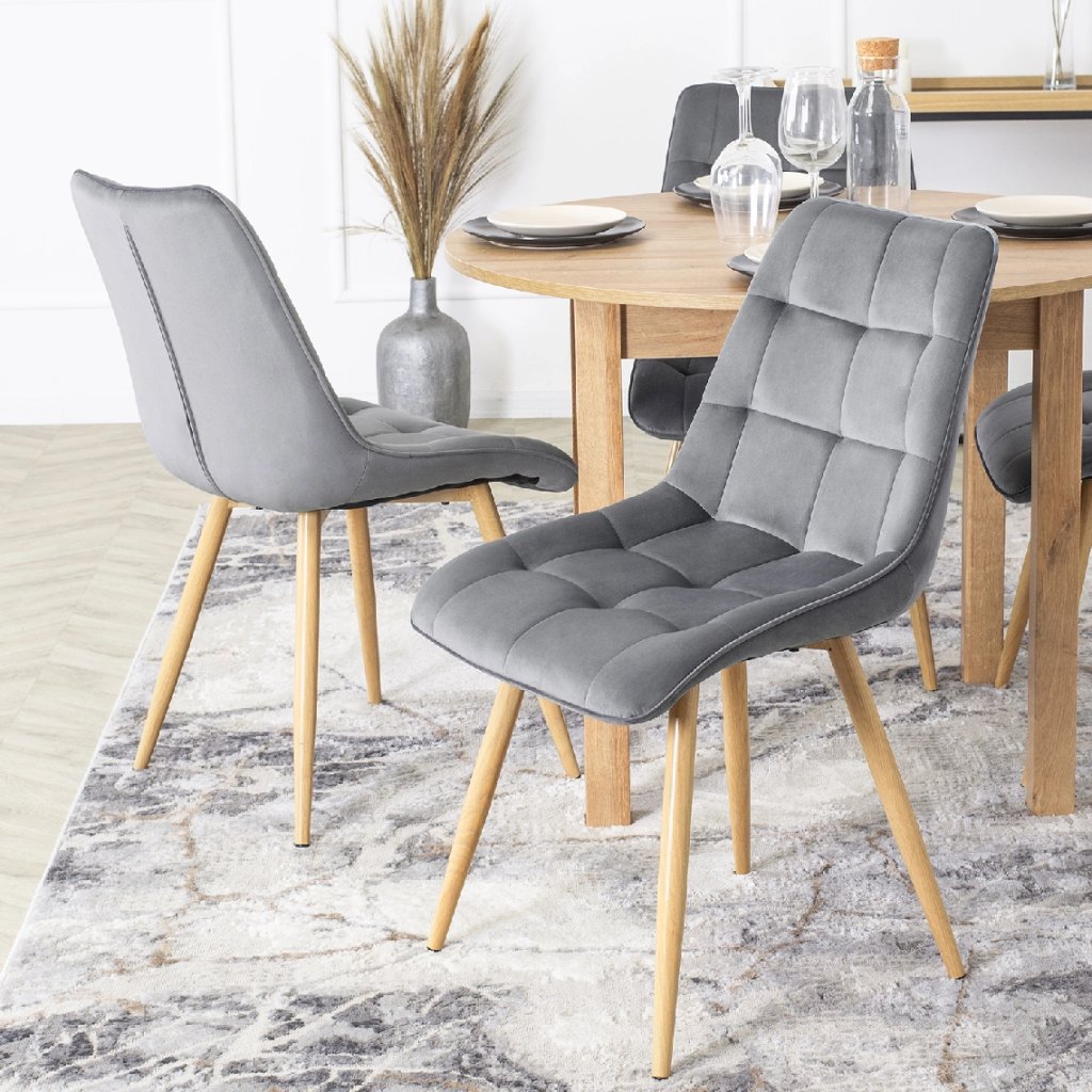 Je čalúnená jemným, príjemným na dotyk materiálom, ktorý jemne mení odtieň pri dotyku, je odolný voči mechaceniu a ľahko sa udržiava. Dekoratívne prešívanie dodáva elegantný vzhľad. Mäkké polstrovanie sedadla a operadla s vrstvou peny zaručuje pohodlné sedenie. Stabilitu poskytuje kovová konštrukcia s nohami v dekore prírodného dreva, ktoré sú pevné a odolné, pričom spodná časť nôh chráni podlahu pred poškriabaním.