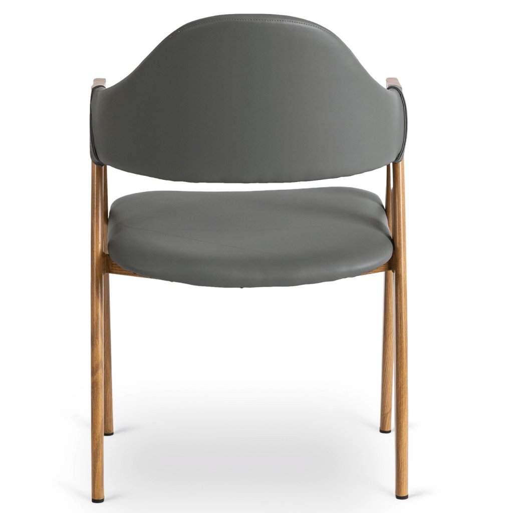 Stolička stojí na stabilných kovových nohách s povrchovou úpravou v odtieni zlatého duba, ktoré krásne kontrastujú so sivým čalúnením a dodávajú celku moderný vzhľad. Nohy sú vybavené ochrannými prvkami proti poškriabaniu podlahy.