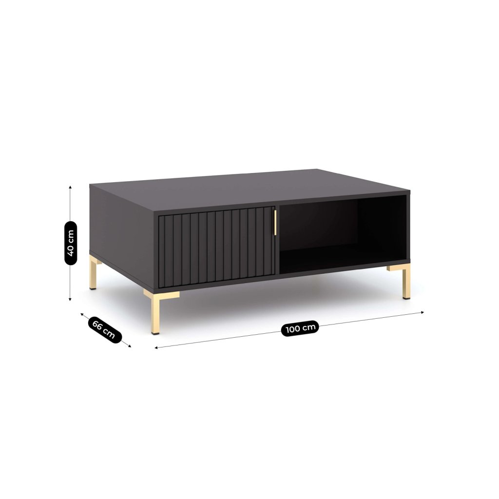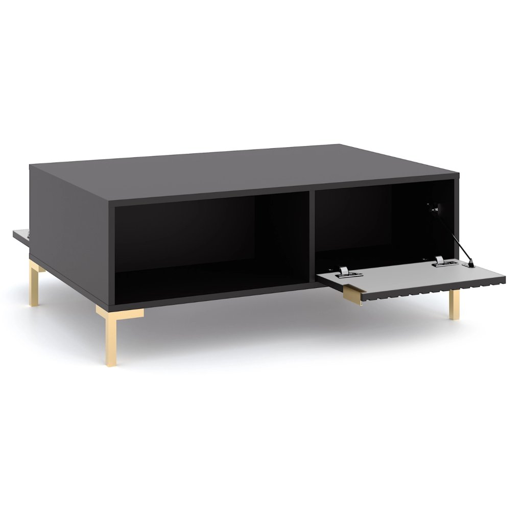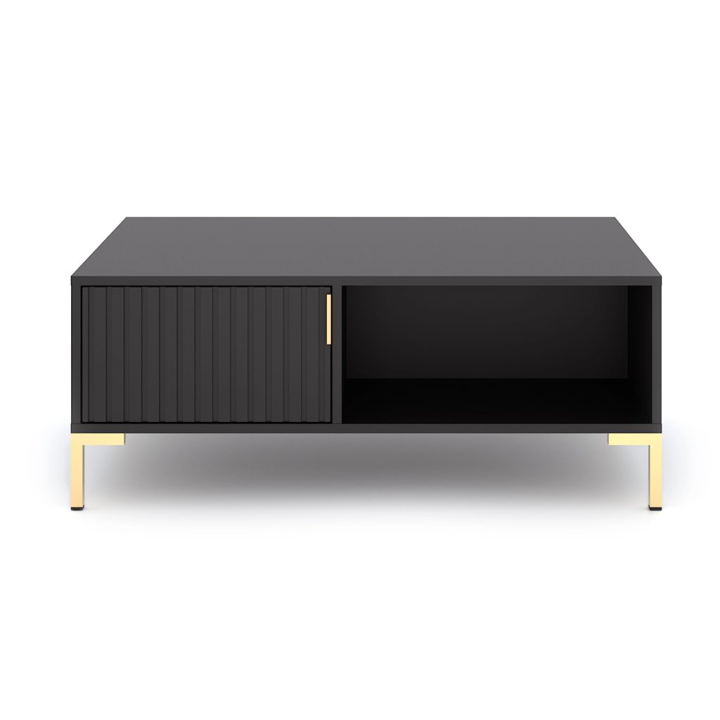 Stolík má praktickú konštrukciu – ponúka otvorenú poličku aj uzavretú časť, čo poskytuje úložný priestor a možnosti usporiadania doplnkov a dekorácií. Stabilné kovové nohy v zlatej farbe mu dodávajú eleganciu a pevný základ.