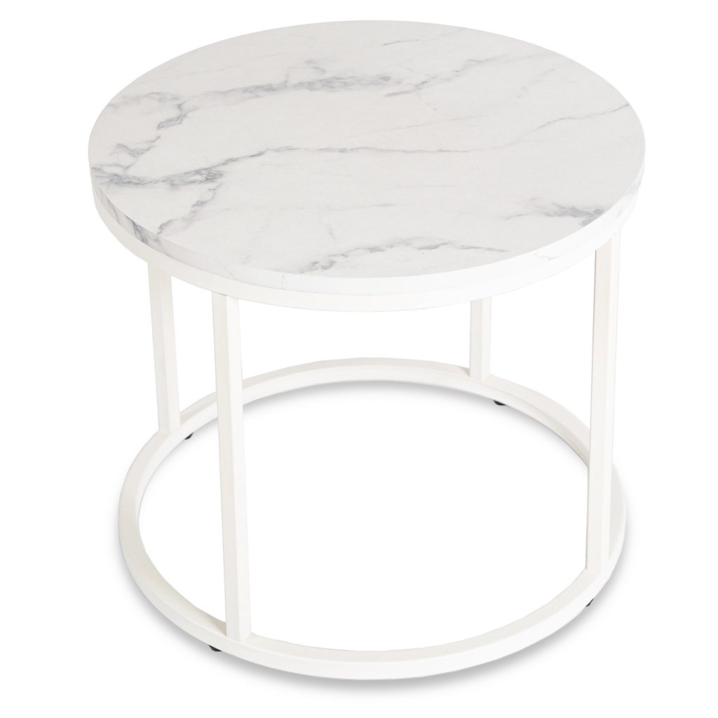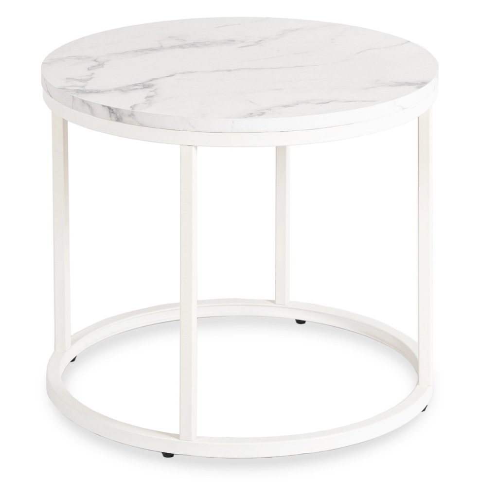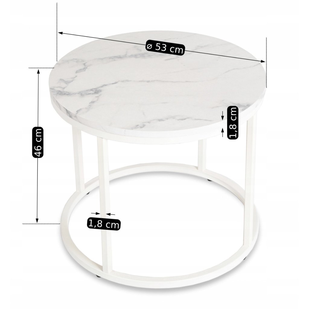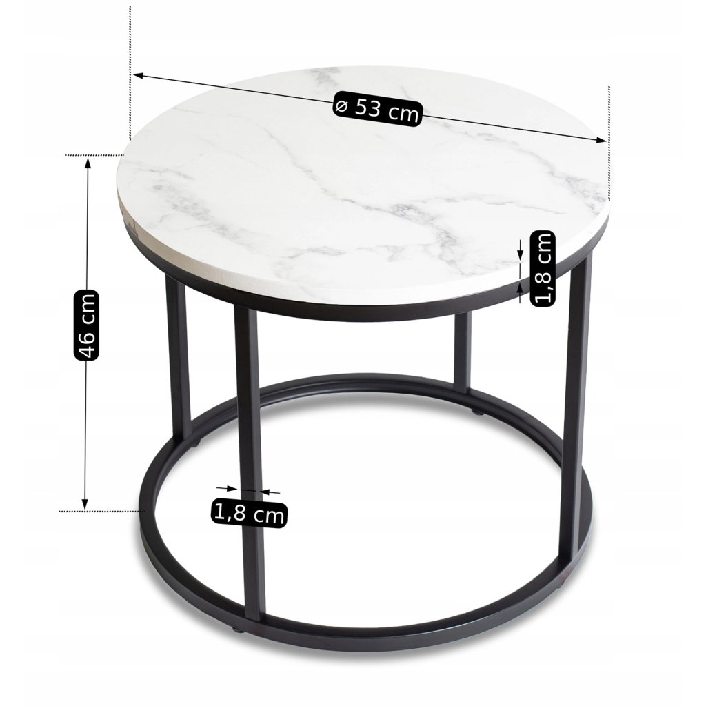 Stolík okrem vizuálneho efektu ponúka výnimočnú kvalitu – vrchná doska je vyrobená z MDF s laminovanou povrchovou úpravou napodobňujúcou biely mramor a konštrukcia je z kovu v čiernej farbe.