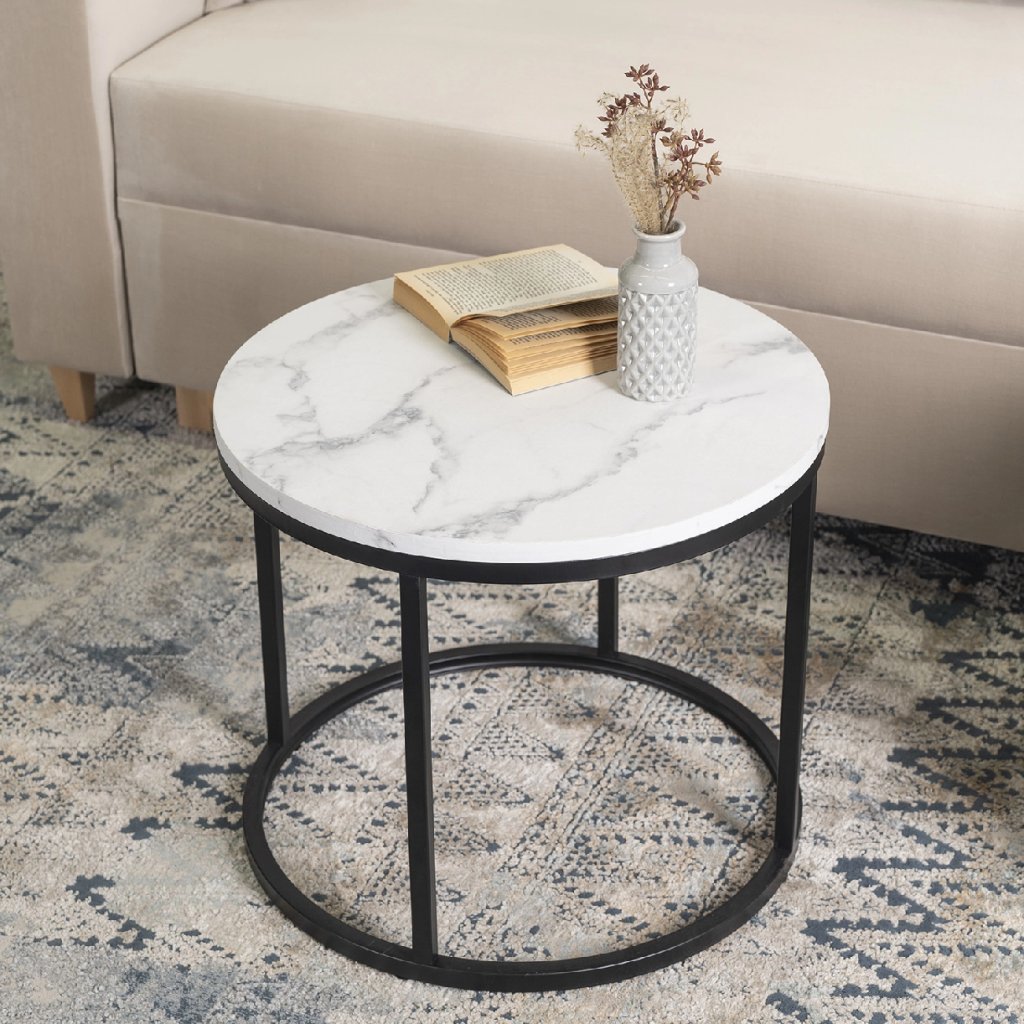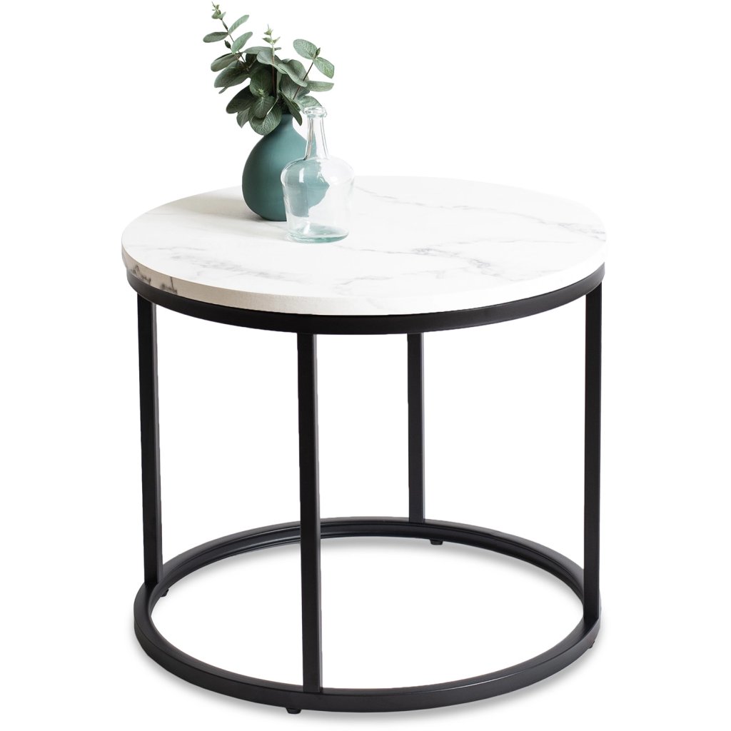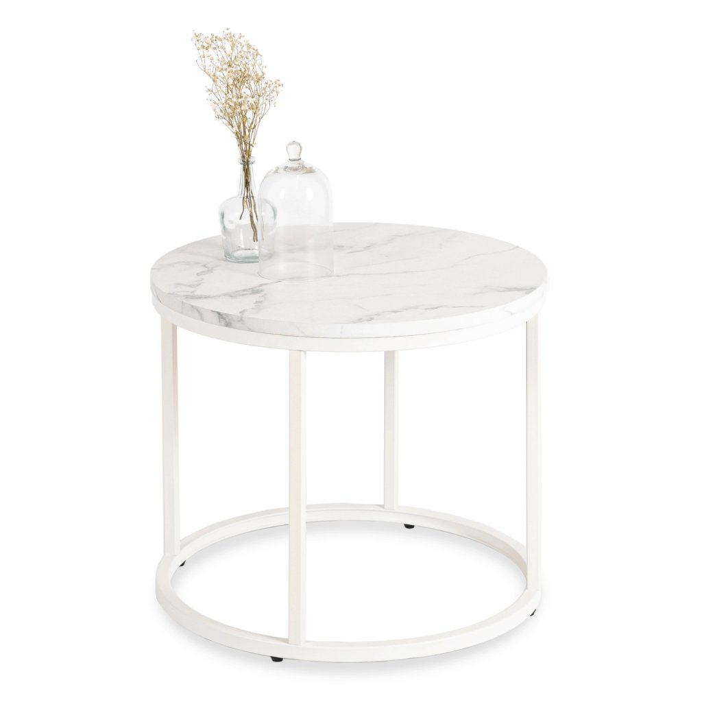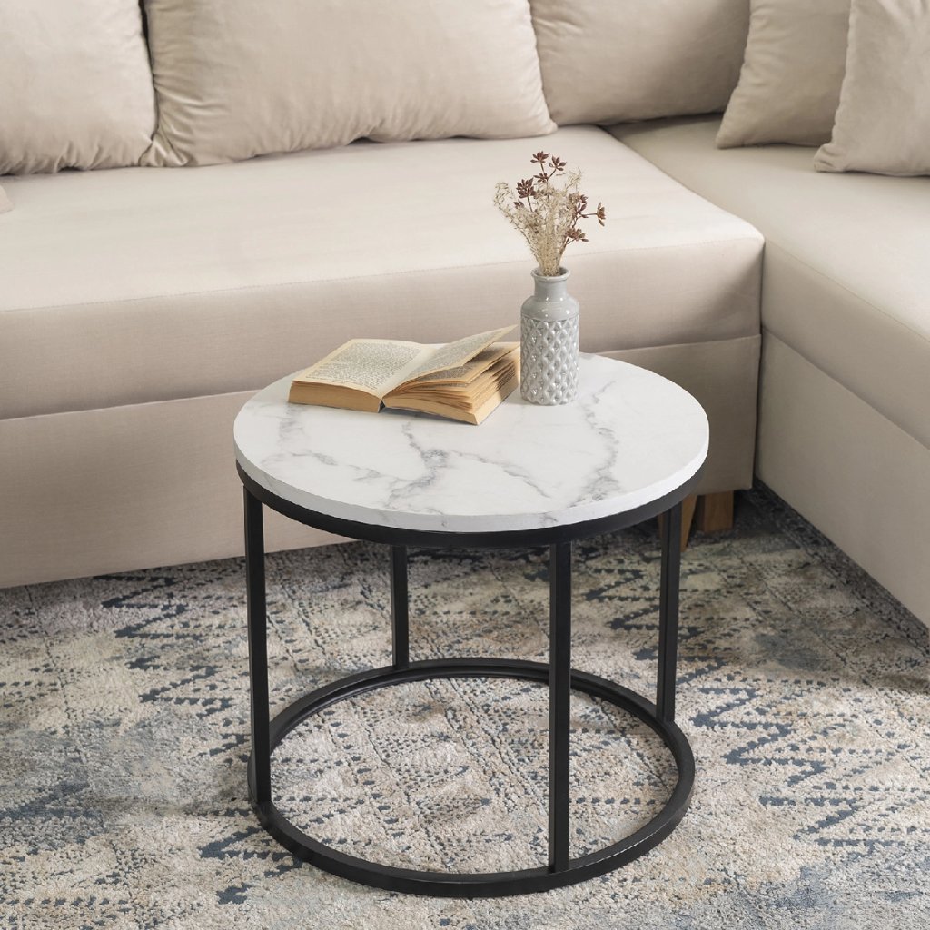 Stolík okrem vizuálneho efektu ponúka výnimočnú kvalitu – vrchná doska je vyrobená z MDF s laminovanou povrchovou úpravou napodobňujúcou biely mramor a konštrukcia je z kovu v čiernej farbe.