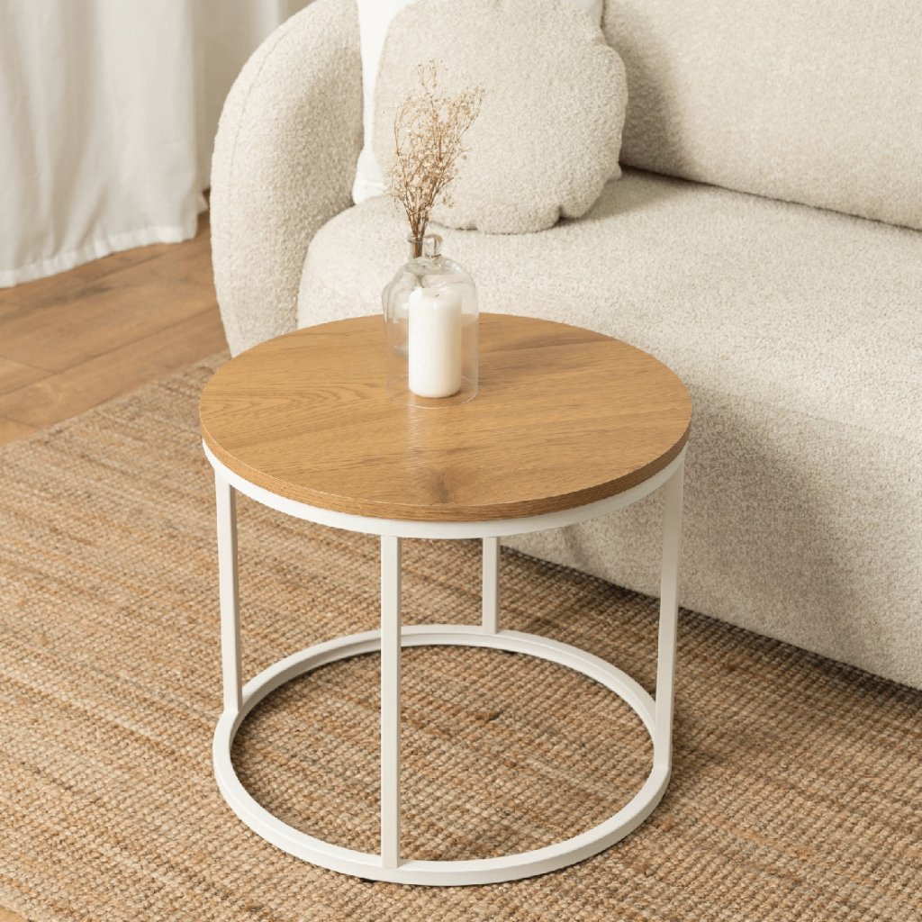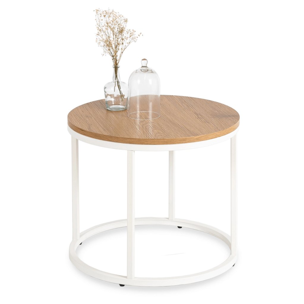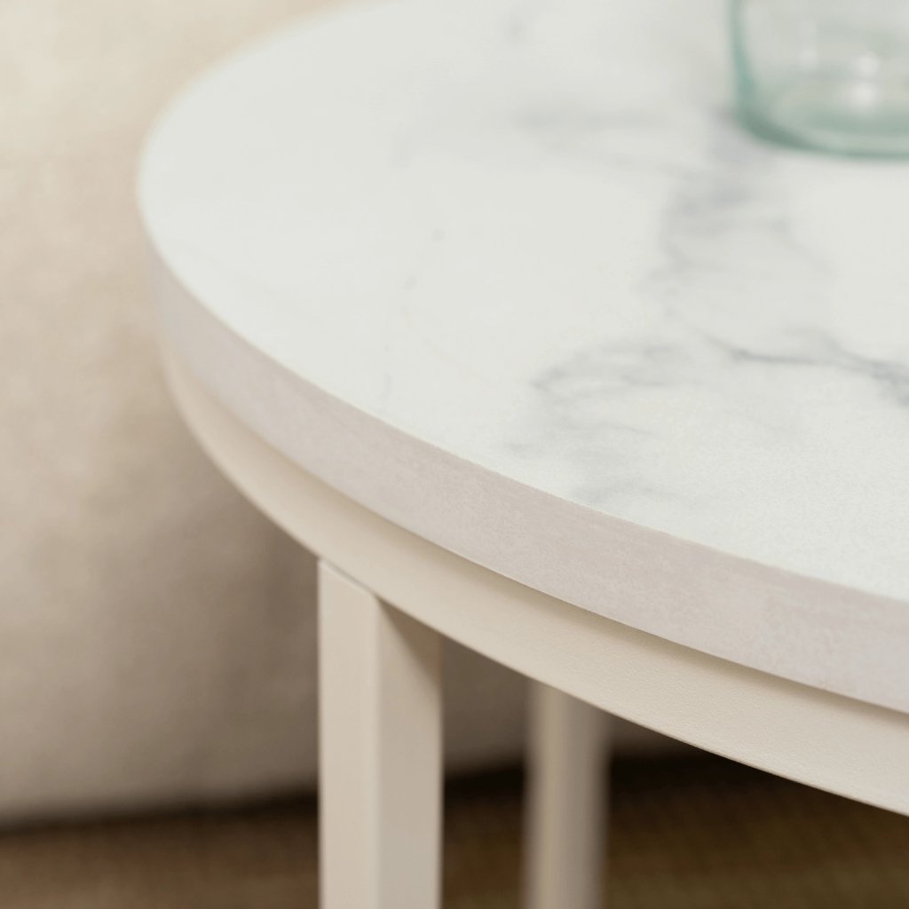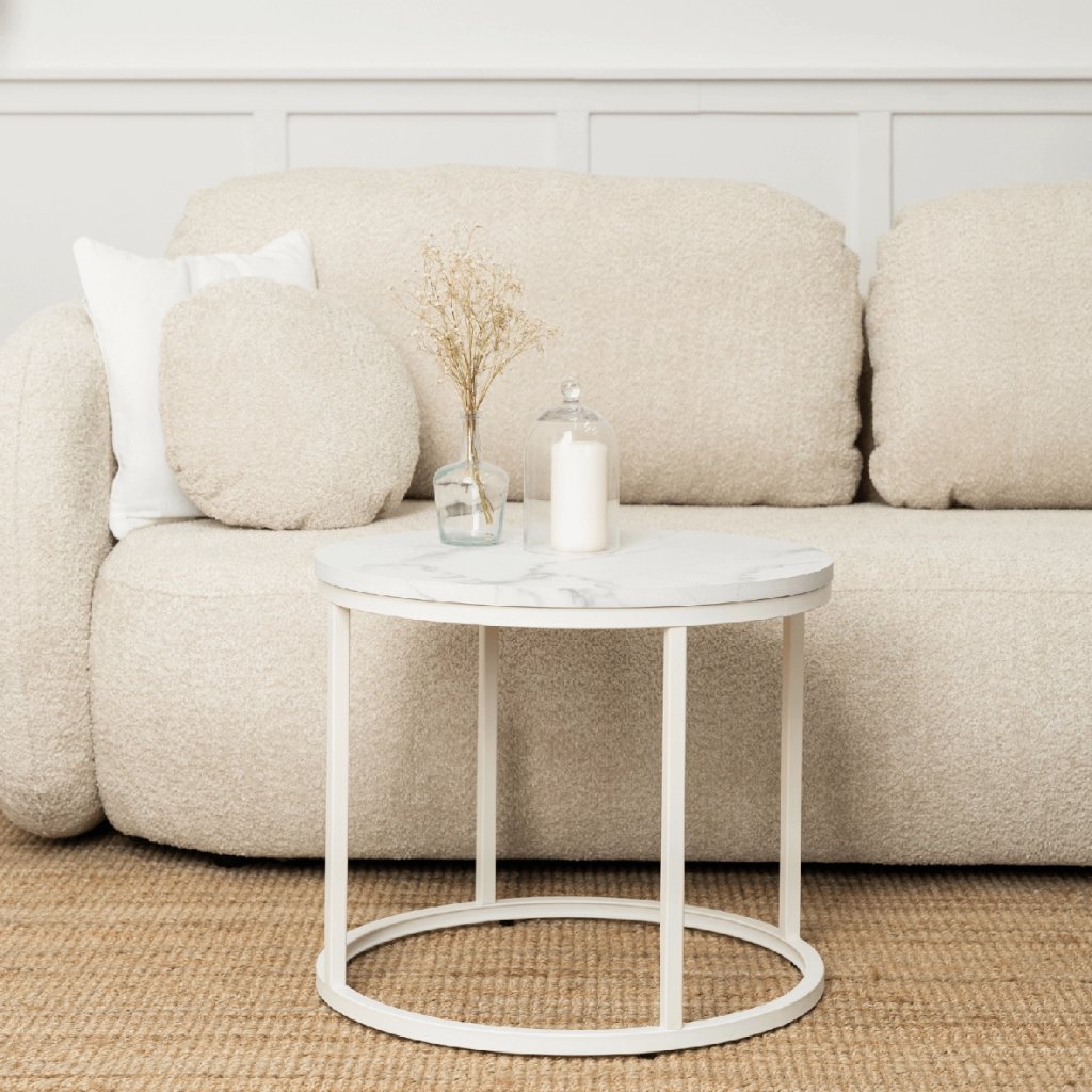 Stolík okrem vizuálneho efektu ponúka výnimočnú kvalitu – vrchná doska je vyrobená z MDF s laminovanou povrchovou úpravou napodobňujúcou biely mramor a konštrukcia je z kovu v čiernej farbe.