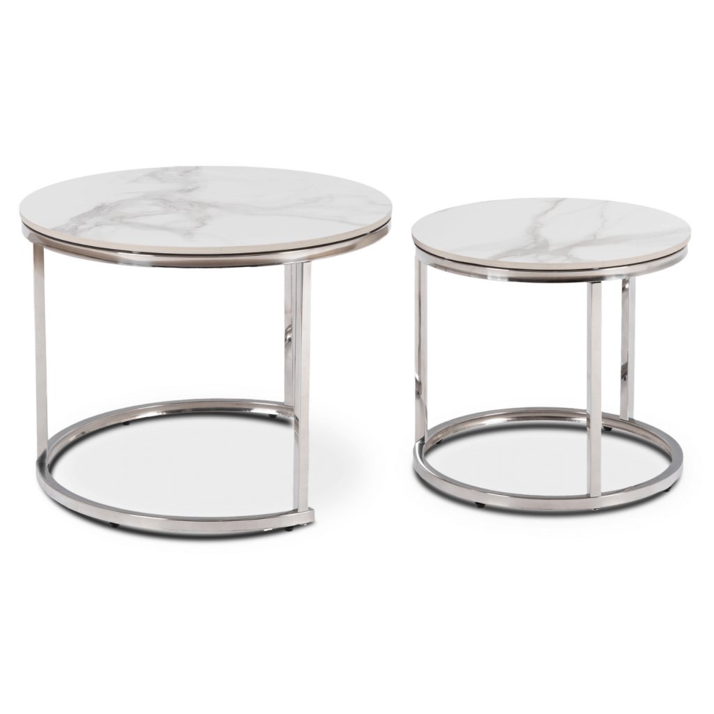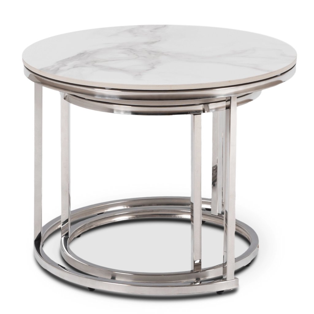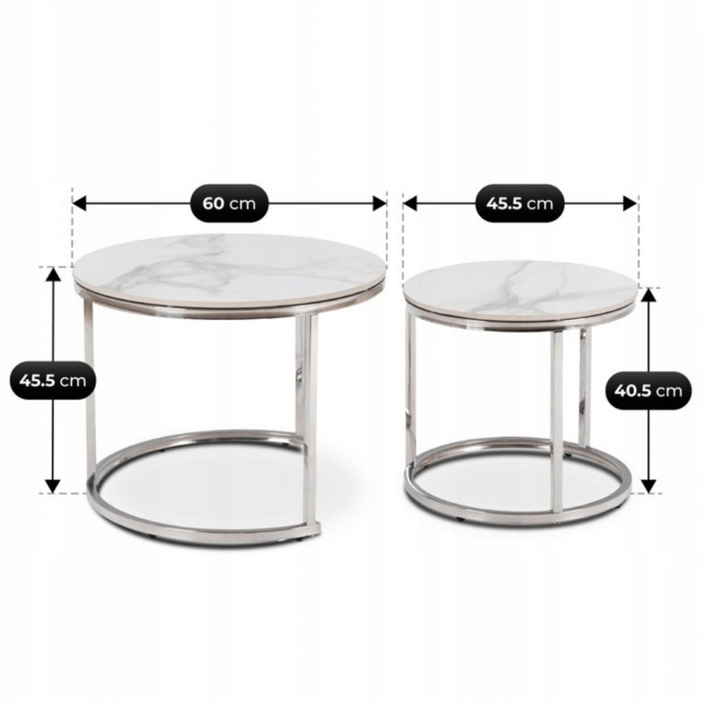 Stolík okrem vizuálneho efektu ponúka výnimočnú kvalitu – vrchná doska je vyrobená z MDF s laminovanou povrchovou úpravou napodobňujúcou biely mramor a konštrukcia je z kovu v čiernej farbe.