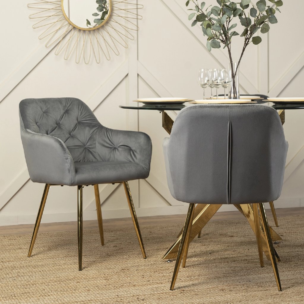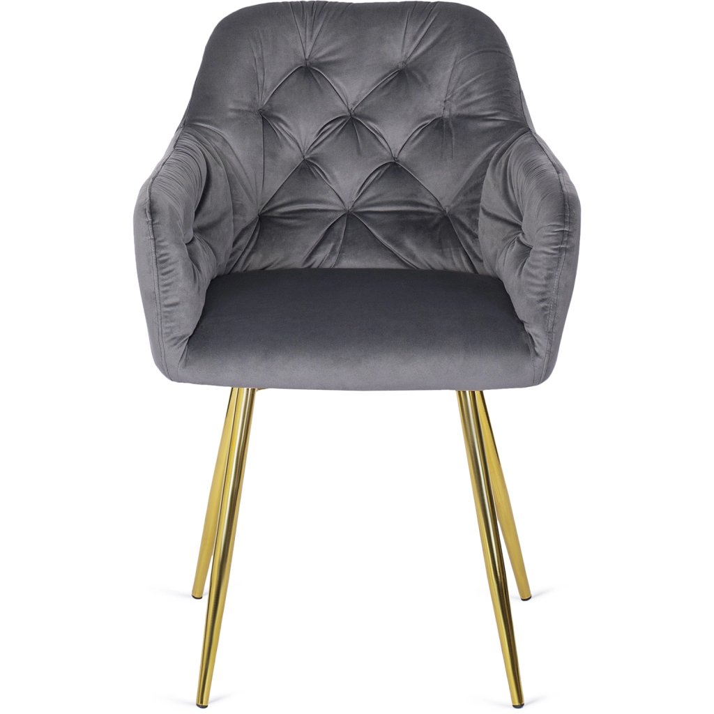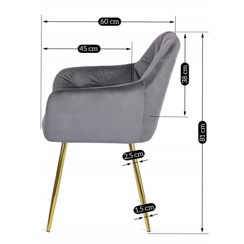 Je čalúnená jemnou zamatovou látkou, ktorá je príjemná na dotyk a odolná voči opotrebovaniu. Dekoratívne prešívanie a jemne tvarované podrúčky dodávajú stoličke sofistikovaný vzhľad. Pevná kovová konštrukcia so zlatými nohami zaisťuje stabilitu a dlhú životnosť, pričom nohy sú navrhnuté tak, aby chránili podlahu pred poškodením.