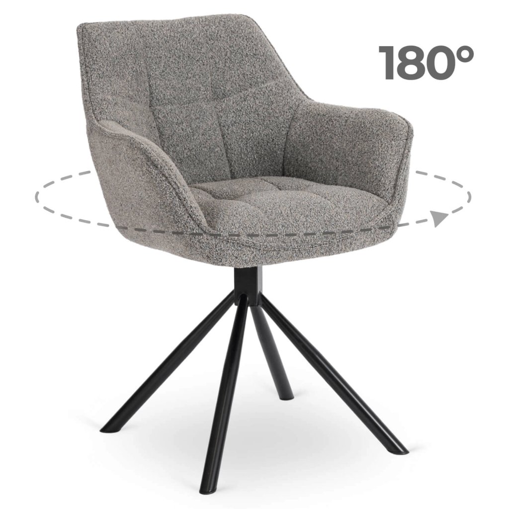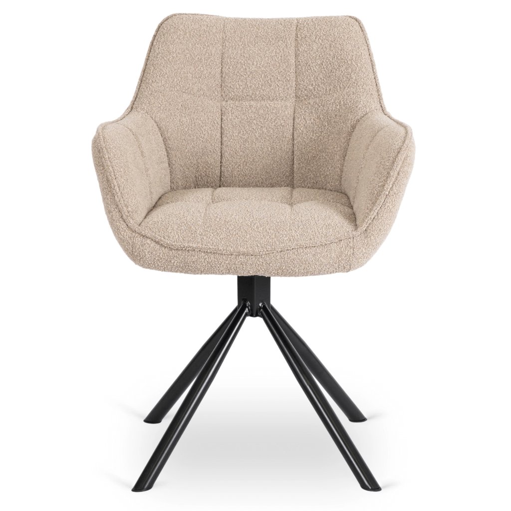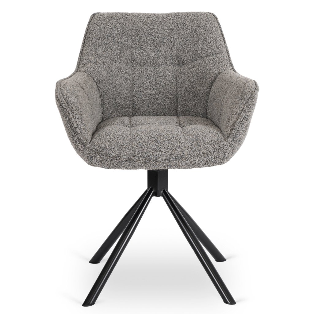 Stolička disponuje otočným sedadlom, stabilnou kovovou konštrukciou s čiernou povrchovou úpravou a nožičkami chrániacimi podlahu. Textília je navrhnutá tak, aby bola príjemná na dotyk a zároveň odolná proti bežnému opotrebeniu.