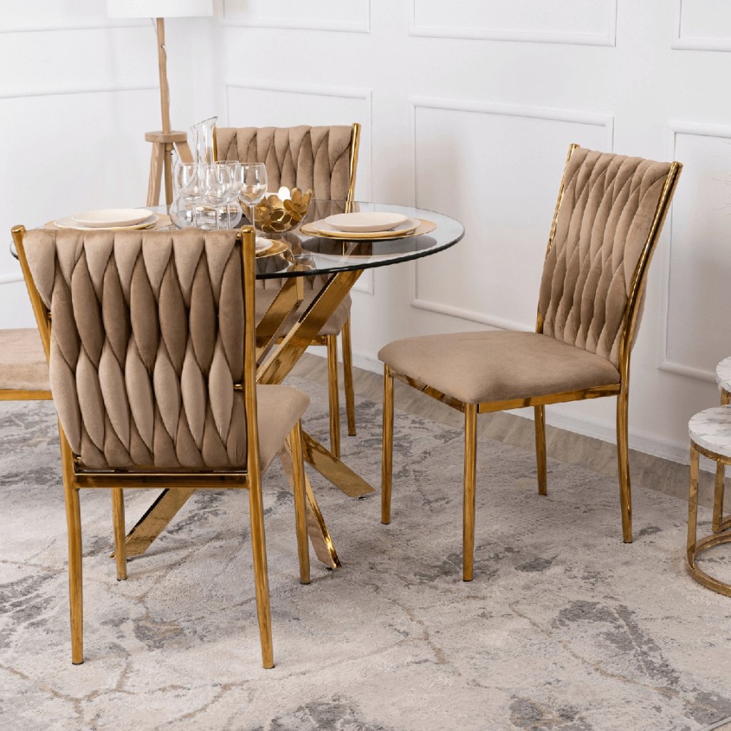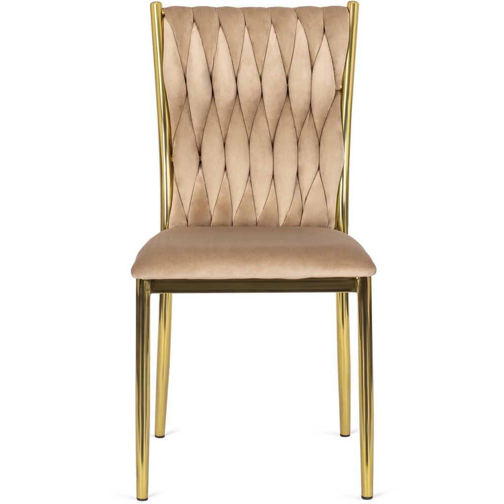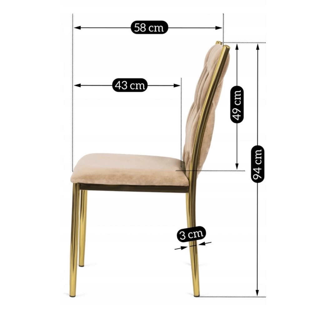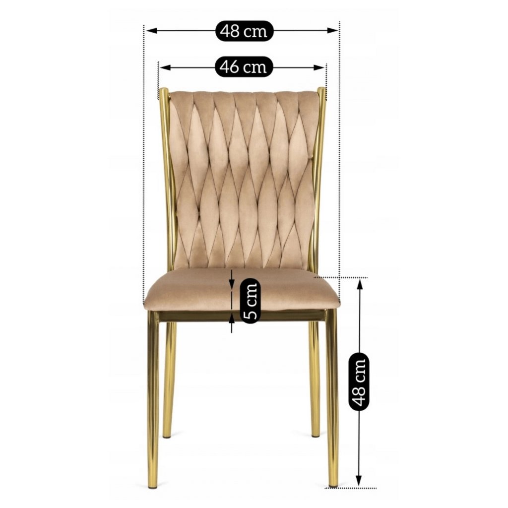 Stolička je vyrobená z najkvalitnejších materiálov. Sedák a operadlo sú potiahnuté zamatovou látkou. Stolička má pevné kovové nohy s práškovým nástrekom v zlatej farbe, ktoré dodajú jedinečný efekt v každom interiéri. Nohy majú ochranu proti poškodeniu podláh.