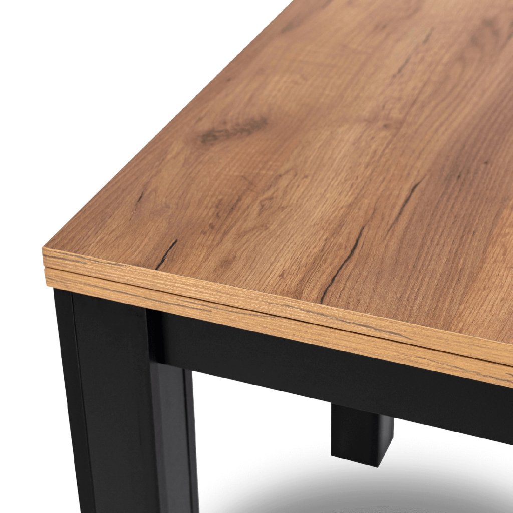 Vďaka rozkladaciemu mechanizmu môže byť stôl v základnej veľkosti vhodný do menšej jedálne, a zároveň sa pri potrebe zväčší až na 160 cm — ideálny pre rodinné obedy alebo návštevy. Spojenie teplého odtieňa dubového dreva s čiernym rámom dodáva stolu univerzálny a nadčasový vzhľad.