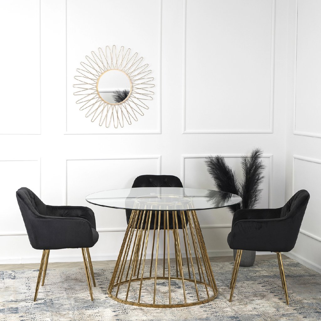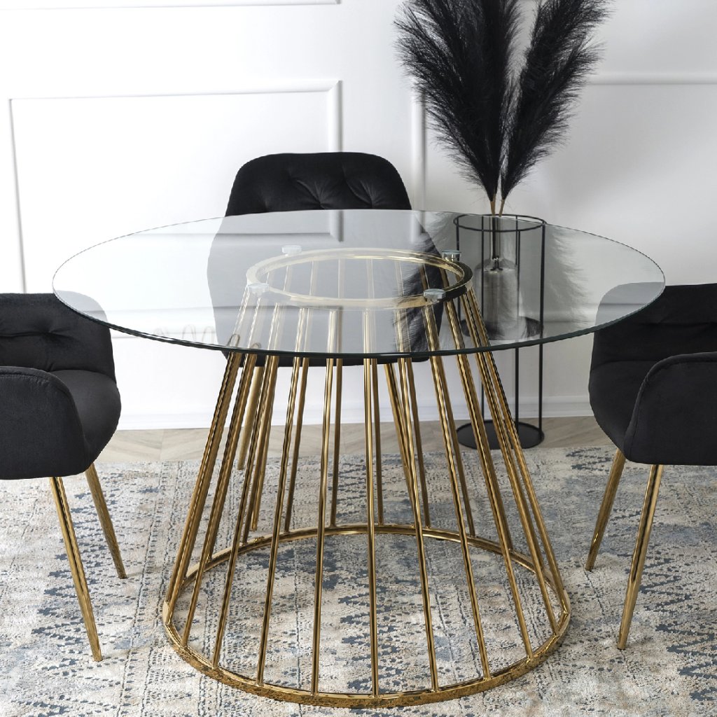Stôl má priehľadný sklenený vrch, ktorý opticky zväčšuje priestor a pôsobí ľahko a vzdušne. Stabilnú základňu tvorí kovová konštrukcia v zlatej farbe, čo pridáva stolíku noblesu a štýl.