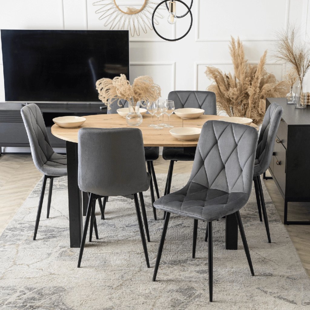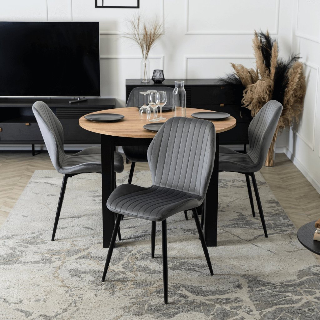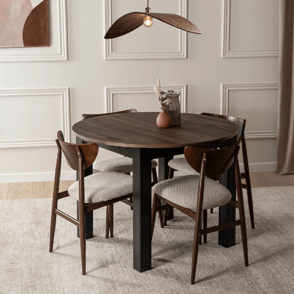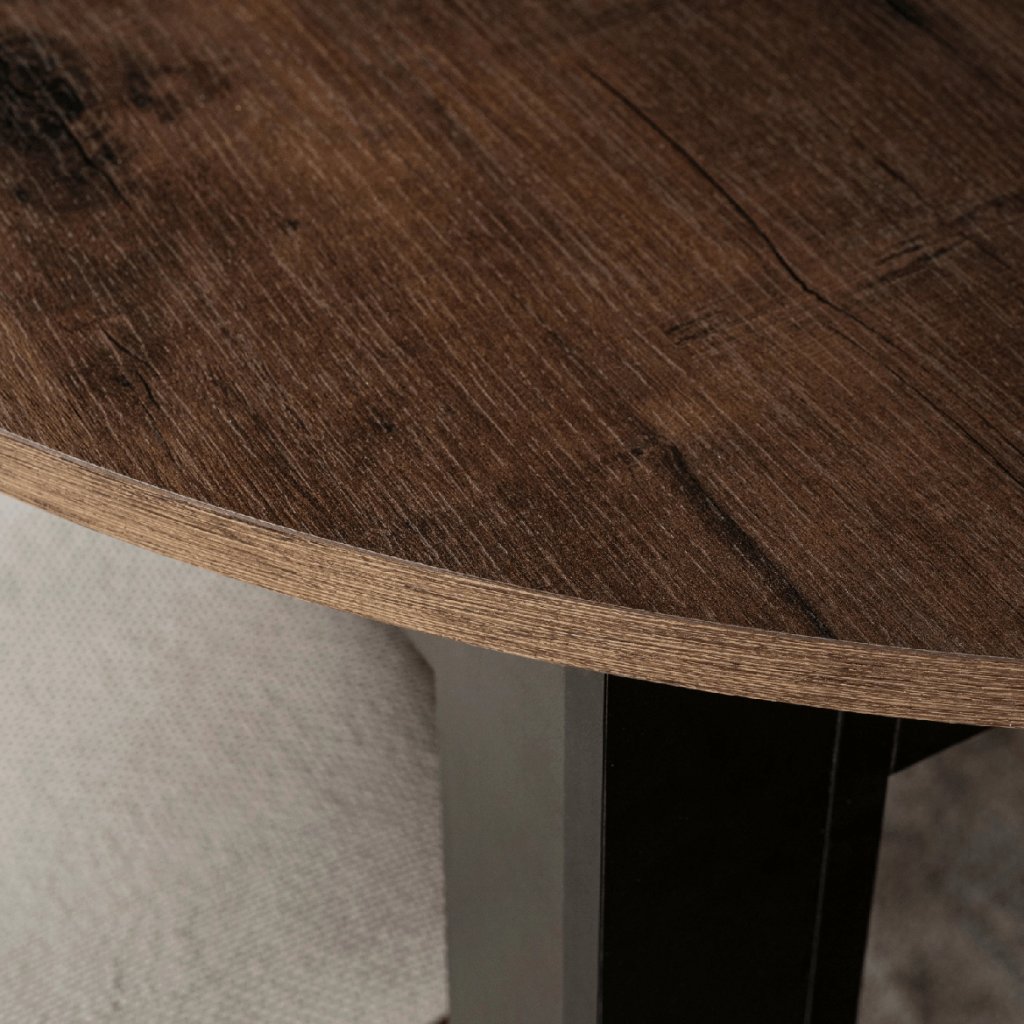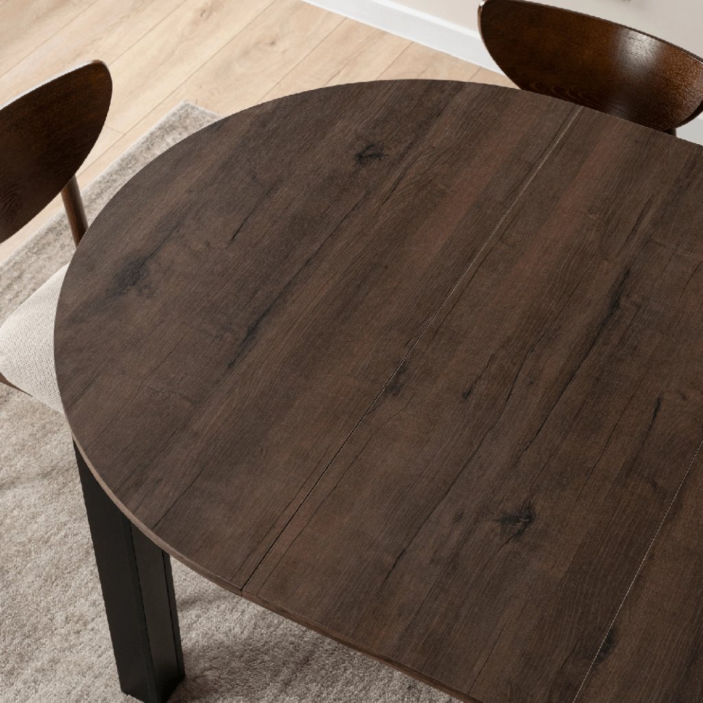 Stôl vyniká svojou flexibilitou — v základnej podobe má priemer 102 cm, pričom vďaka rozkladaciemu mechanizmu môžete jeho šírku rozšíriť až na 142 cm, čo umožní pohodlne usadiť viac osôb. Stabilná konštrukcia z MDF a dobre spracovaná doska zabezpečujú dlhú životnosť a komfort pri používaní.