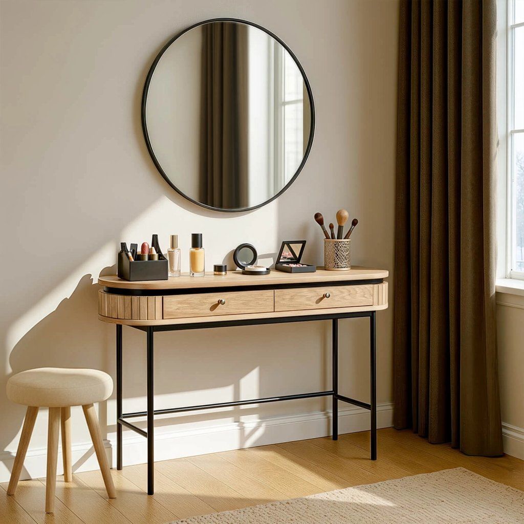 Okrúhly tvar jej dodáva jemnosť a elegantný charakter, zatiaľ čo ryhované (lamelové) čelá vytvárajú vizuálne zaujímavý, nadčasový detail. Dve zásuvky s hladkým chodom ponúkajú dostatok úložného priestoru na kozmetiku, dokumenty alebo drobnosti.
