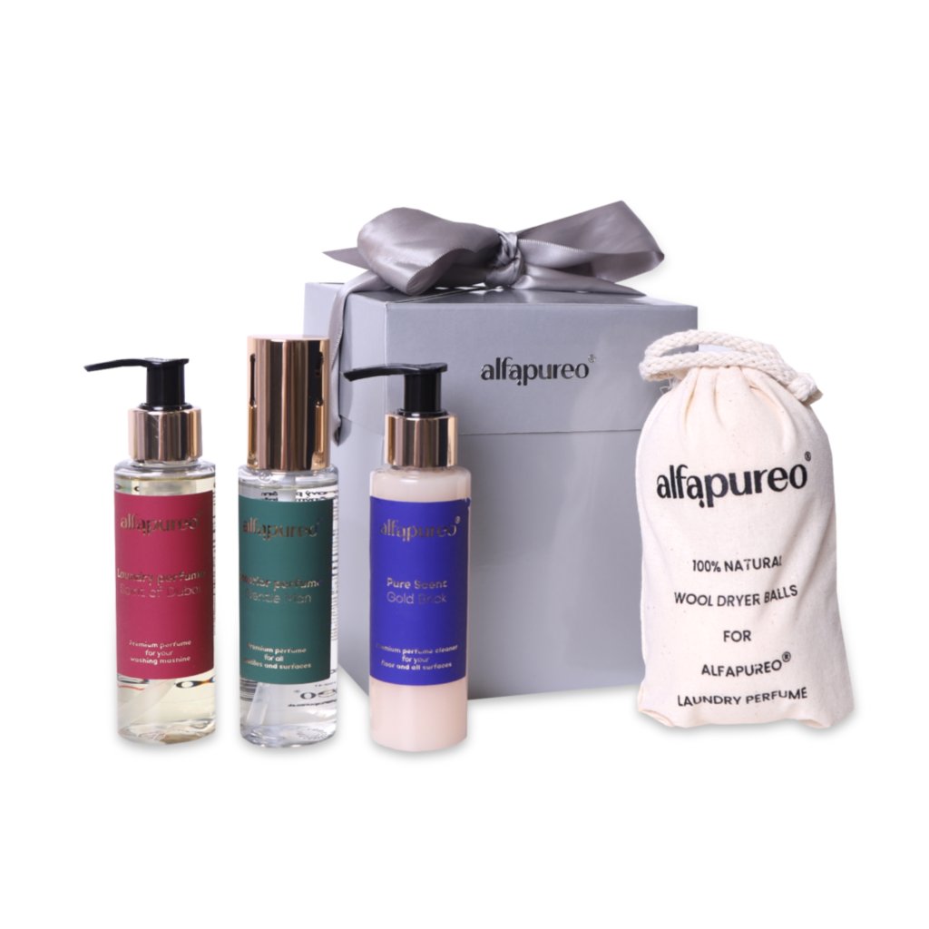 Do kolekcie patrí aj bytový parfém Gentle Man s výraznou pánskou vôňou, ktorá kombinuje svieže tóny jablka a citrusov s kvetinovým srdcom a základom zo santalového dreva, vetiveru a cédru. Tento parfém nielen prevonia váš interiér, ale aj účinne dezinfikuje, pričom ničí 99,9% baktérií. Súčasťou sady je aj exkluzívny olej do prania Spirit of Dubai s orientálnou vôňou, ktorý v sebe spája akvatické a drevité tóny s nádychom ruže, jazmínu a vzácnych drevín.