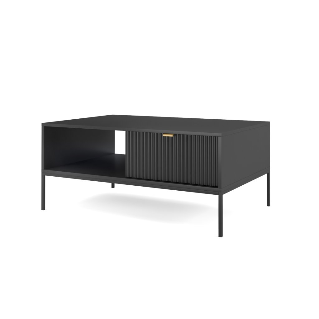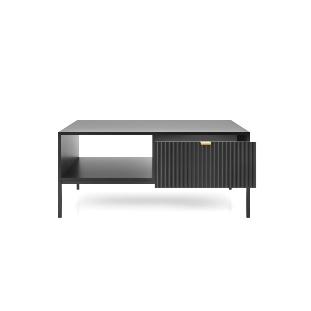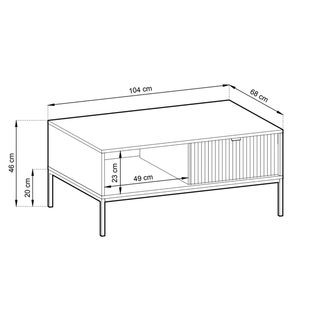 Konferenčný stolík zo série nábytku NOVA vyniká svojimi zlatými detailami, ktoré jej pridávajú na elegancii. Do vašej obývacej izby prinesie dostatok úložného priestoru a za zmienku stojí aj to, že stojí na vysokých nohách, čo vám zjednoduší údržbu podláh. Stolík má praktické rozmery.