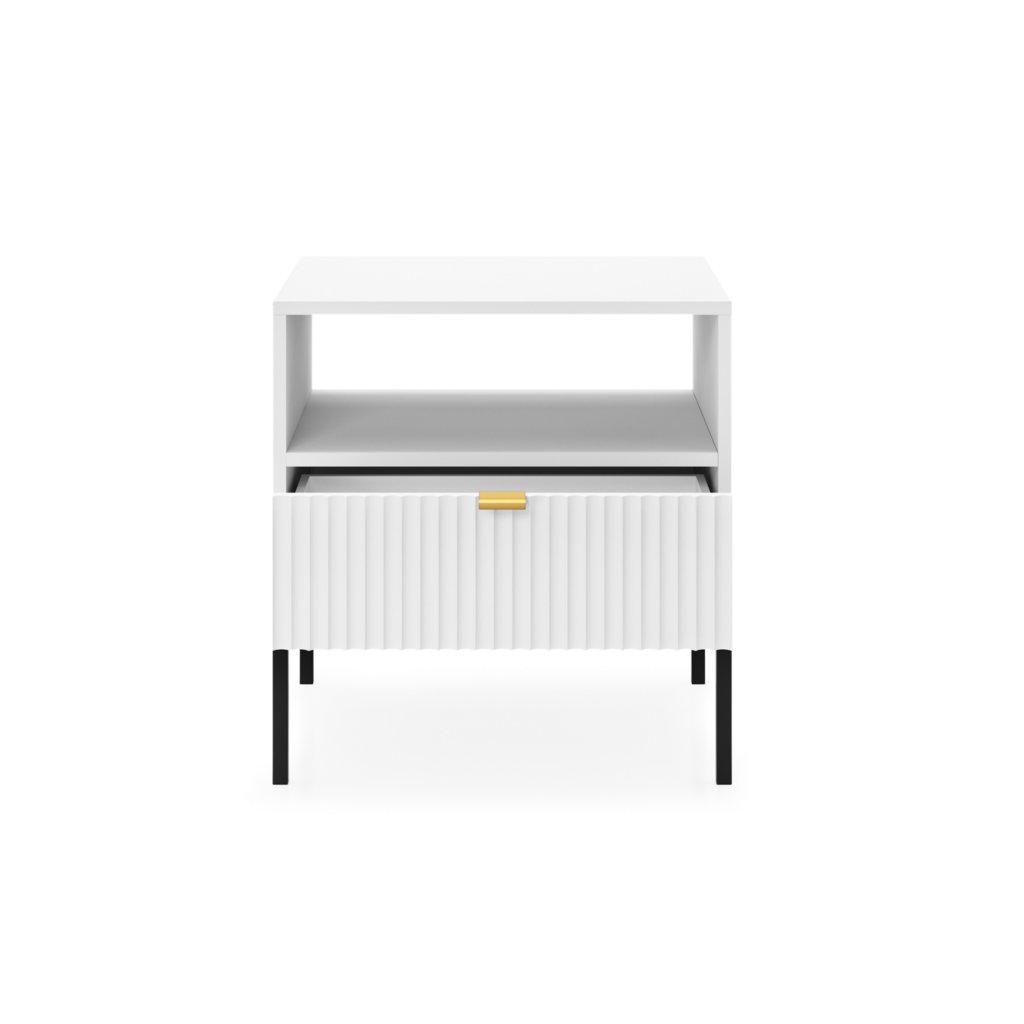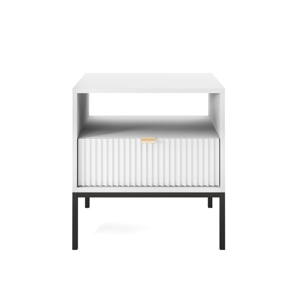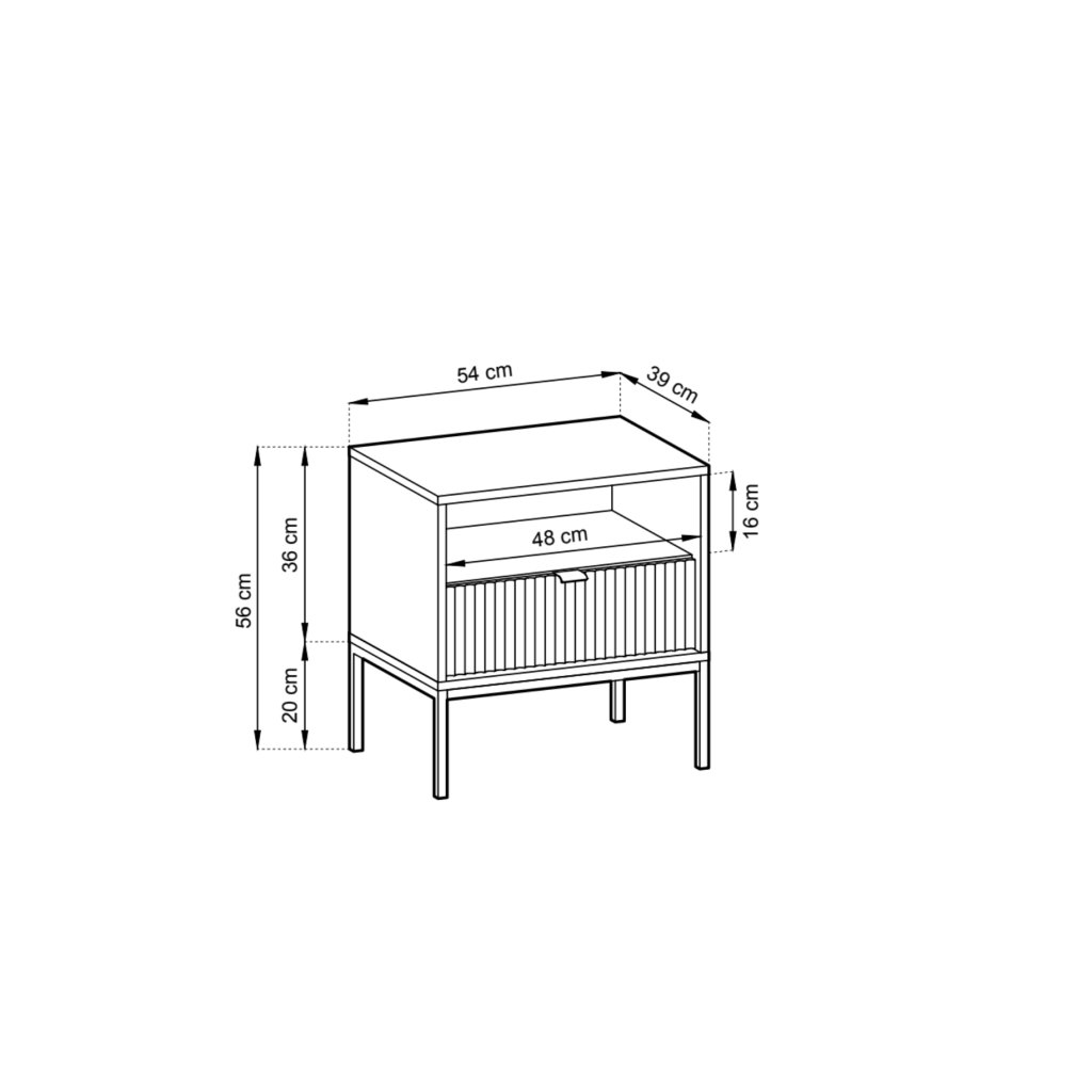 Nočný stolík zo série nábytku NOVA vyniká svojimi zlatými detailami, ktoré jej pridávajú na elegancii. Do vašej spálne prinesie dostatok úložného priestoru a za zmienku stojí aj to, že stojí na vysokých nohách, čo vám zjednoduší údržbu podláh. Stolík má praktické rozmery.