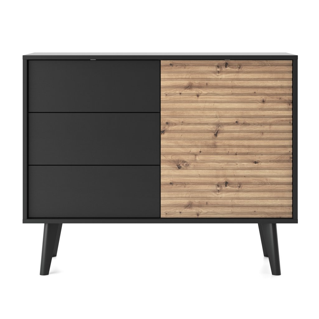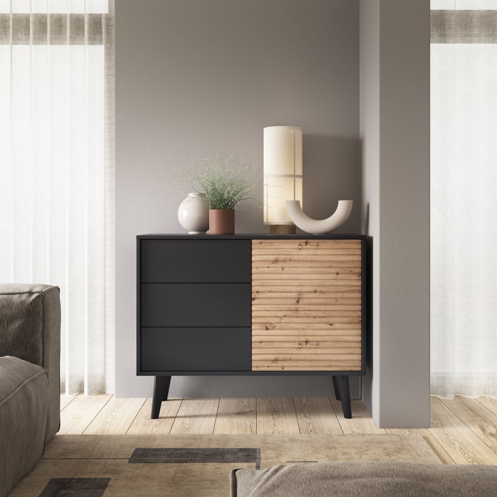 Komoda zo série nábytku RAMONA vyniká svojou jednoduchosťou, ktorá mu pridávajú na jedinečnosti. Do vašej obývacej izby prinesie dostatok úložného priestoru a za zmienku stojí aj to, že stojí na vysokých nohách, čo vám zjednoduší údržbu podláh.